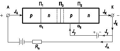 На рисунке 11 приведена схема тринистора, используемая для расчета вольт- амперных характеристик в закрытом состоянии.