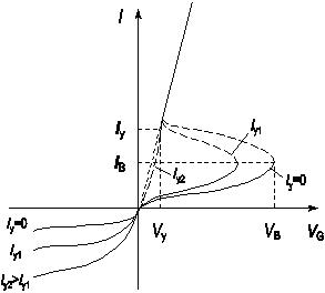 Уравнение (11) описывает ВАХ тиристора в закрытом состоянии, по-скольку коэффициенты М, а1 и а2 зависят от напряжения Vg.