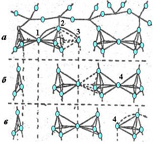 После разрыва связи атома кислорода, находящегося в точке 1 (рис.19 а), с атомом Si, расположенным в центре левого тетраэдра, происходит поворот правого тетраэдра на угол ≈70o вокруг двух неподвижных атомов кислорода в направлении, указанном стрелкой. В результате короткоживущий немостиковый атом кислорода 1 занимает положение атома 2, а атом 2 переходит в положение 3, становясь немостиковым. Теперь немостиковый атом кислорода уже удален от трехкоординированного кремния на расстояние порядка 5 Аo. Если немостиковый атом кислорода окажется вблизи следующего тетраэдра на расстоянии, достаточном для того, чтобы атом кремния переместился через треугольник атомов кислорода, образуя состояние, изображенное пунктиром на рис.19 б, то немостиковым становится уже атом 4. Последующее перемещение немостикового кислорода показано стрелкой на рис.19 в. Процесс удаления немостикового атома кислорода от трехкоординированного кремния можно трактовать как диффузию этого дефекта в стеклообразной сетке окисла кремния. Энергия активации процесса будет соответствовать величине энергетического барьера, который требуется преодолеть при повороте тетраэдра и может оказаться меньше, чем энергия разрыва одной кремний-кислородной связи, поскольку в момент переключения при повороте атом кремния взаимодействует одновременно с обоими атомами кислорода, участвующими в процессе переключения.