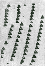 Рис. 7. Ряды фигур травления вдоль малоугловых границ в кристалле сурьмы.
