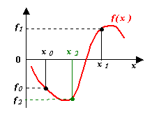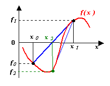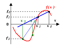 Идея метода проиллюстрирована рисунком. Задается интервал [ x0, x1], на котором f(x0)f(x1) ≤ 0, между точками x0 и x1 строится хорда, стягивающая f(x). Очередное приближение берется в точке x2, где хорда пересекает ось абсцисс. В качестве нового интервала для продолжения итерационного процесса выбирается тот, на концах которого функция имеет разные знаки. Условия выхода из итерационного цикла: