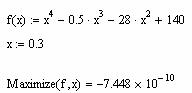 Поиск экстремума функции включает в себя задачи нахождения локального и глобального экстремума. С помощью встроенных функций решается только задача поиска локального экстремума. Чтобы найти глобальный максимум (или минимум), требуется сначала вычислить все их локальные значения и потом выбрать наибольший (наименьший), либо предварительно просканировать с некоторым шагом рассматриваемую область, чтобы выделить из нее наибольших (наименьших) значений функции и осуществить поиск глобального экстремума, уже находясь в его окрестности.