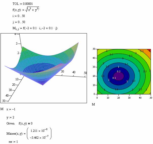 Вычисление экстремума функции многих переменных не несет принципиальных особенностей по сравнению с функциями одной переменной. Но также поиск экстремума можно организовать с помощью функции Minerr: