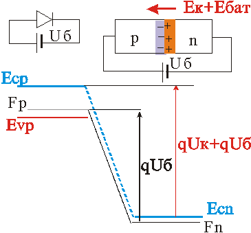 высота барьера увеличивается на величину напряжения батареи: Uк + Uб. Такое включение принято называть обратным, при