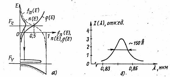 В отличии от лазеров на активных атомах, ионах или молекулах, в которых вероятность заполнения энергетических уровней описывается функцией Больцмана, в полупроводниковых лазерах излучение происходить между двумя энергетическими зонами, вероятность, заполнения которых электронами описывается функцией распределения Ферми-Дирака fn. При инжекции неравновесных носителей через p-n переход (или иных способах накачки) плотности вероятности распределения электронов в зоне проводимости и в валентной зоне в ряде случаев удовлетворительно описывается функцией распределения fnc и fnv, в которых вместо общего уровня Ферми F фигурируют квазиуровни Ферми Fс и Fv при чем Fс > Fv (случай Fс = Fv удовлетворяет термодинамическому равновесию). Такое состояние иногда называют «квазистабильным» - энергетическое равновесие при инжекции неравновесных носителей (при том время релаксации в полупроводниках t ~ 10-12 – 10-13 c, а время жизни носителя 10-8 - 10-9с).