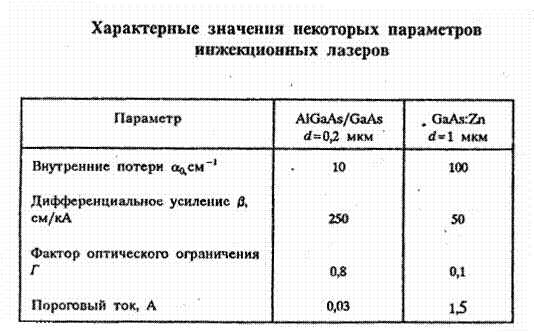 Eg - ширина запрещённой зоны полупроводника. При нарушении этого условия наблюдается спонтанное испускание. В полупроводниках плотность неравновесных носителей, ответственных за излучение может превышать 10-18см-3, в связи с чем появляется возможность генерировать большую световую мощность при малом объёме активной области (усиление полупроводниковых сред самое высокое из существующих и составляет g ~ 104см-1). Высокое усиление позволяет создавать компактные лазерные резонаторы длиной всего в несколько микрометров и использовать в качестве его зеркал сколотые торцы самого кристалла (для GaAs показатель преломления n = 3,5, откуда коэффициент отражения при нормальном падении света R= (n-1)2/(n+1)2 = 31%. Компактность в сочетании с высокой квантовой эффективностью (100% - внутренняя, 40-50% внешняя) - главная особенность, особенность отличающая полупроводниковые лазеры от других типов.